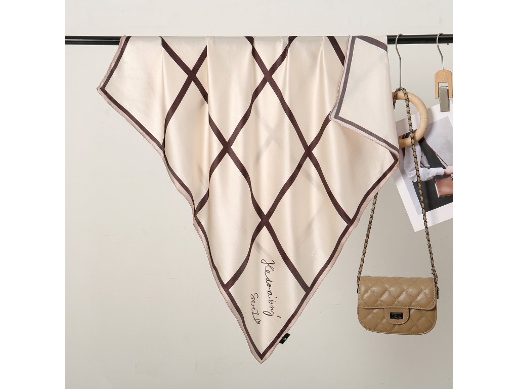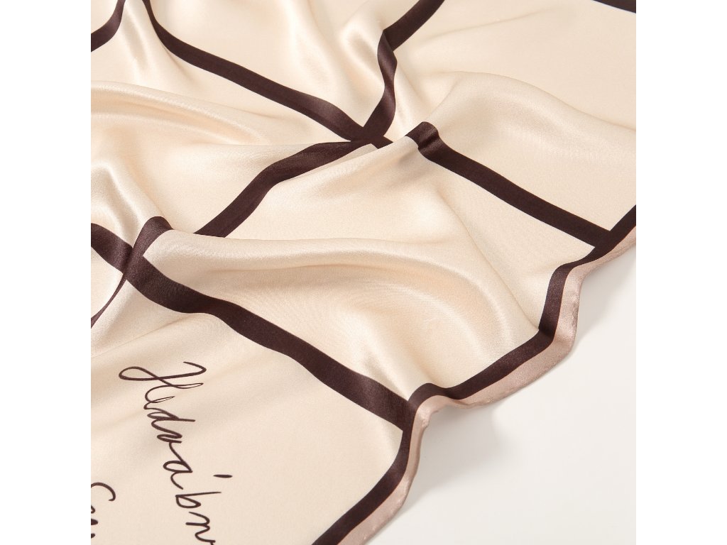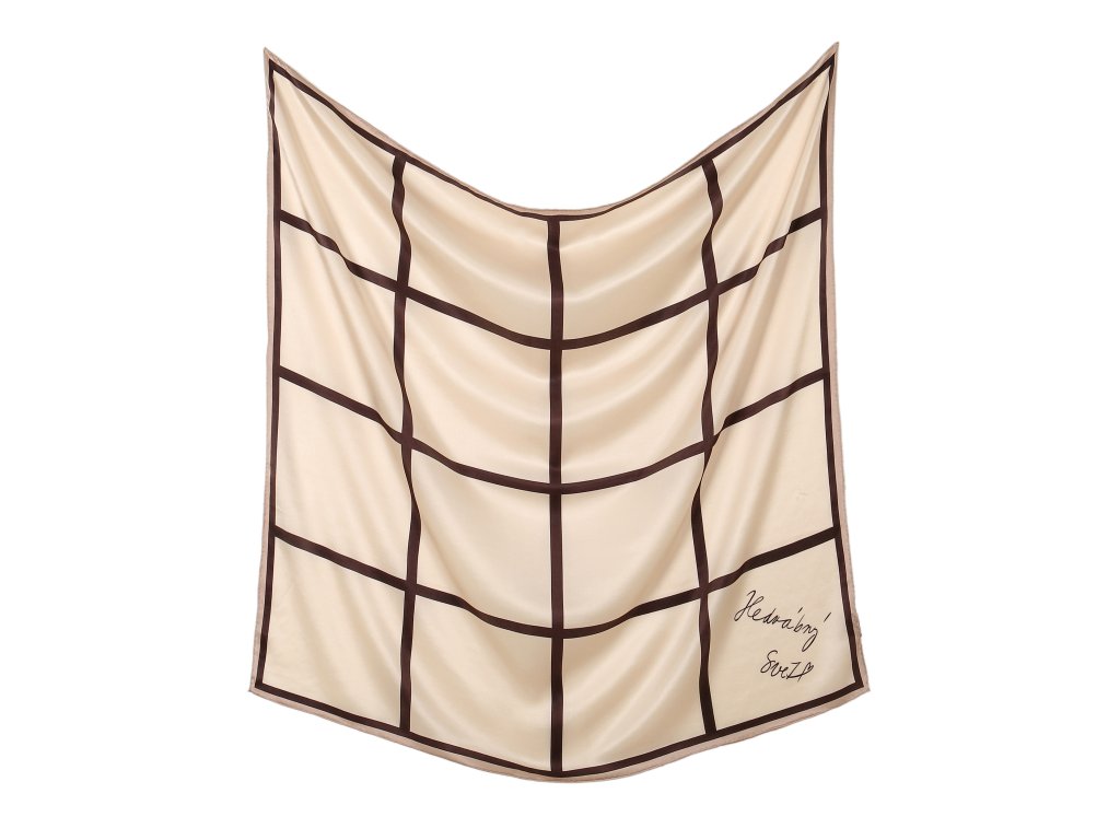 Nádherný, elegantní a jednoduchý - přesně tak by se dal popsat hedvábný šátek v tmavě béžové barvě s tmavě hnědými čtverci a středně hnědým okrajem. Je vyroben z prémiového 100% morušového hedvábí o síle 14 vláken s ručně rolovaným okrajem. Šátek je dárkově zabalen do hedvábného papíru a ozdobné kraftové krabičky se jmenovkou.