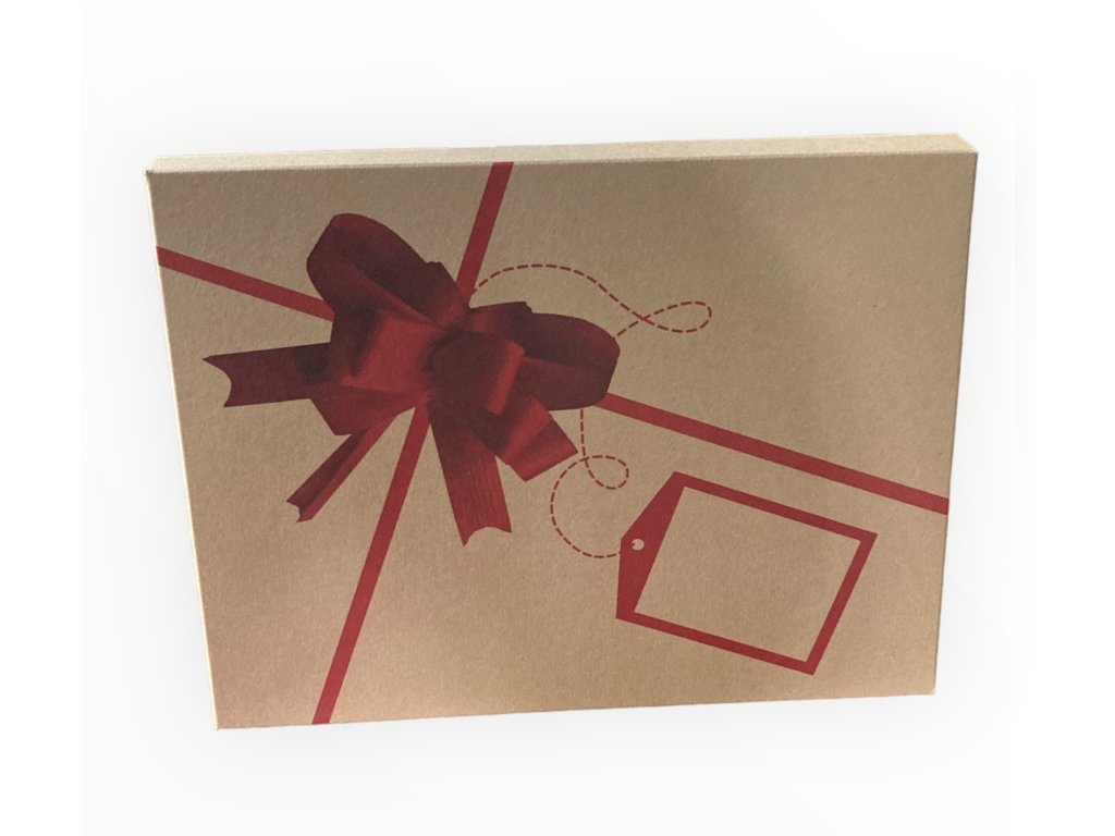 Šátek je zabalen v dárkové krabičce z kvalitního kraftového papíru, takže už ji stačí jen předat. Na přední straně má natištěnou jmenovku pro napsání jména obdarované osoby.