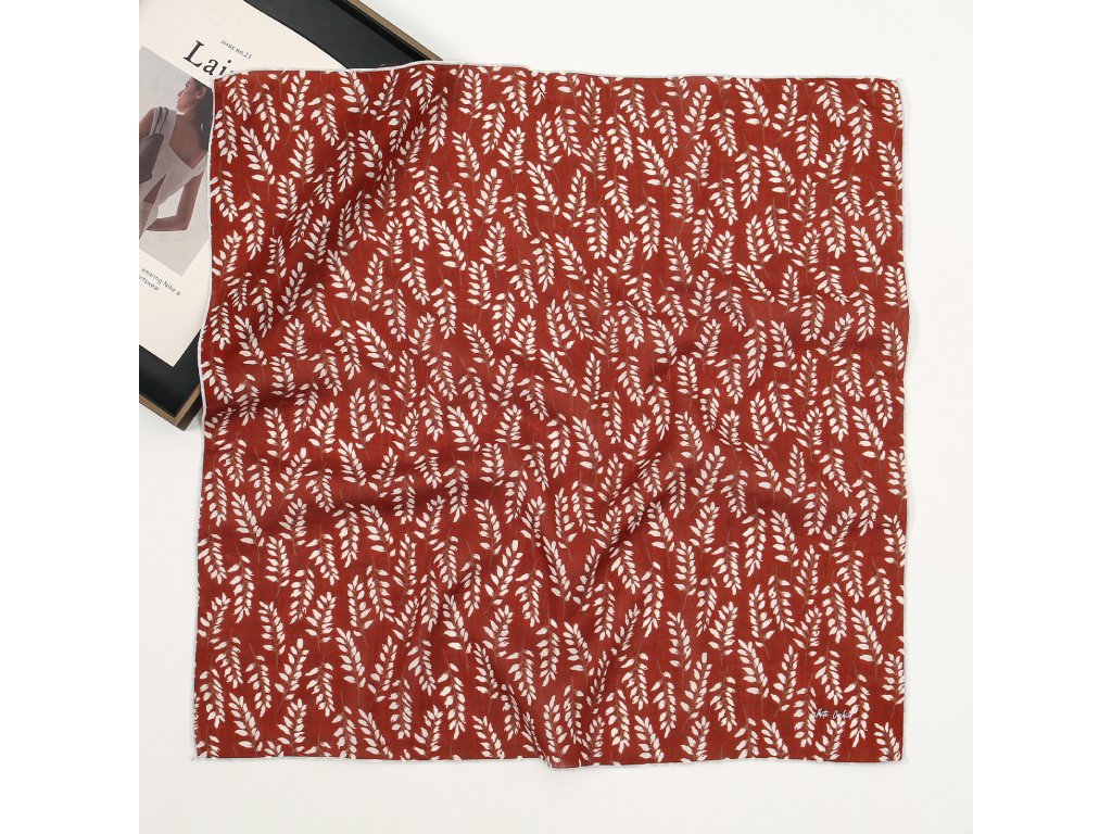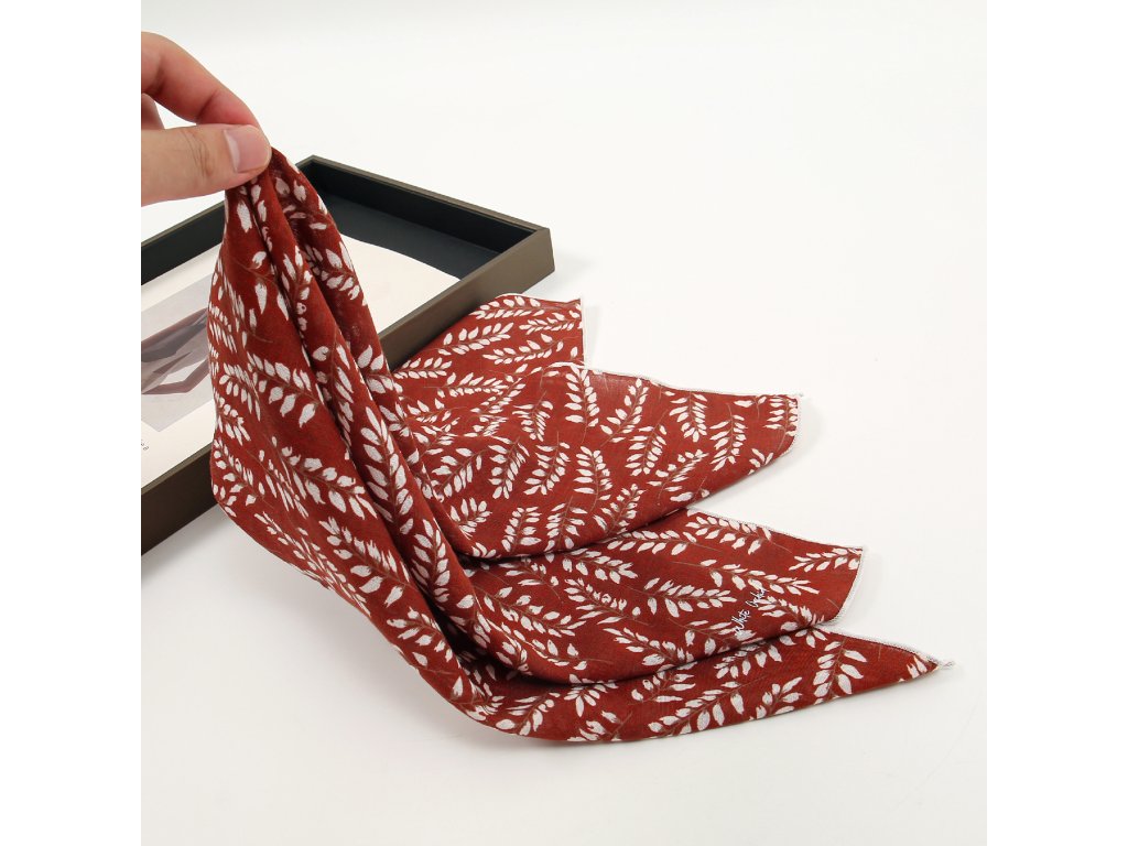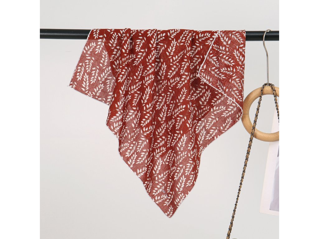Kvalitní bavlněný šátek v syté červené barvě doplněné hnědo-bílými větvičkami. Tento výrazný kousek je báječným doplňkem, který pozvedne všední outfit a dodá mu šťávu. Šátek můžete použít na vlasy, kde skvěle drží - pro jejich ochranu před sluncem, kolem krku nebo dále jako ozdobu na ruku či na kabelku apod. Ideální také jako plnohodnotná velikost pro dítě kolem krku. Bavlna ve spojení s viskózou zajistí šátku prodyšnost, savost, ale také měkkost, hebkost a minimální mačkavost.