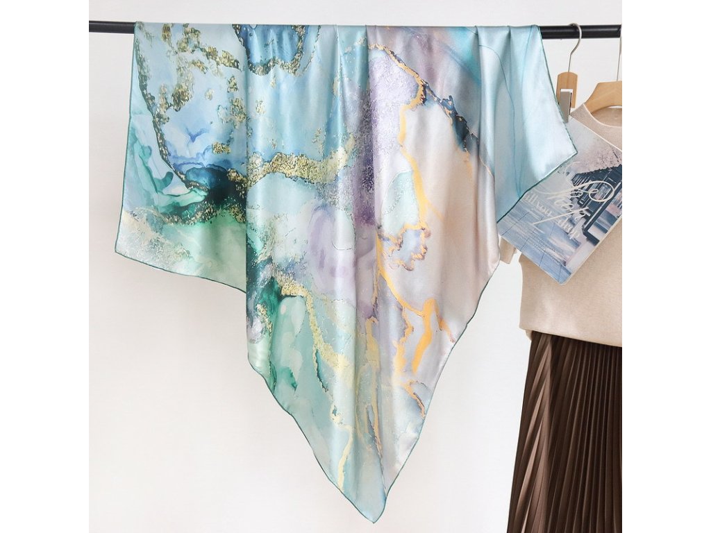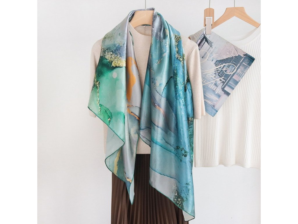 Materiál: 100% morušové hedvábí, provedení satin silk s ručně rolovanými okraji, kvalita obvyklá pro šátky 12 vláken.
