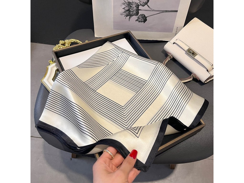Nápaditý šátek s černými liniemi na krémově bílém podkladu. Jemný design působí svěže a elegantně, ideální pro každodenní nošení i formálnější příležitosti. Je vyroben z prémiového 100% morušového hedvábí o síle 12 vláken s jemně lemovaným okrajem v černé barvě. Šátek lze nosit na krku, na ruce, ve vlasech nebo jím ozdobit kabelku. Exkluzivní limitovaná edice, která je rovnou dárkově zabalena do hedvábného papíru a ozdobné kraftové krabičky se jmenovkou.