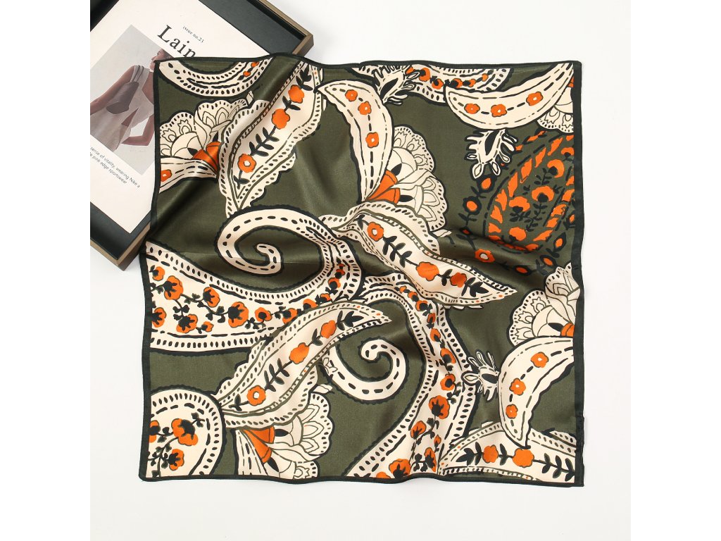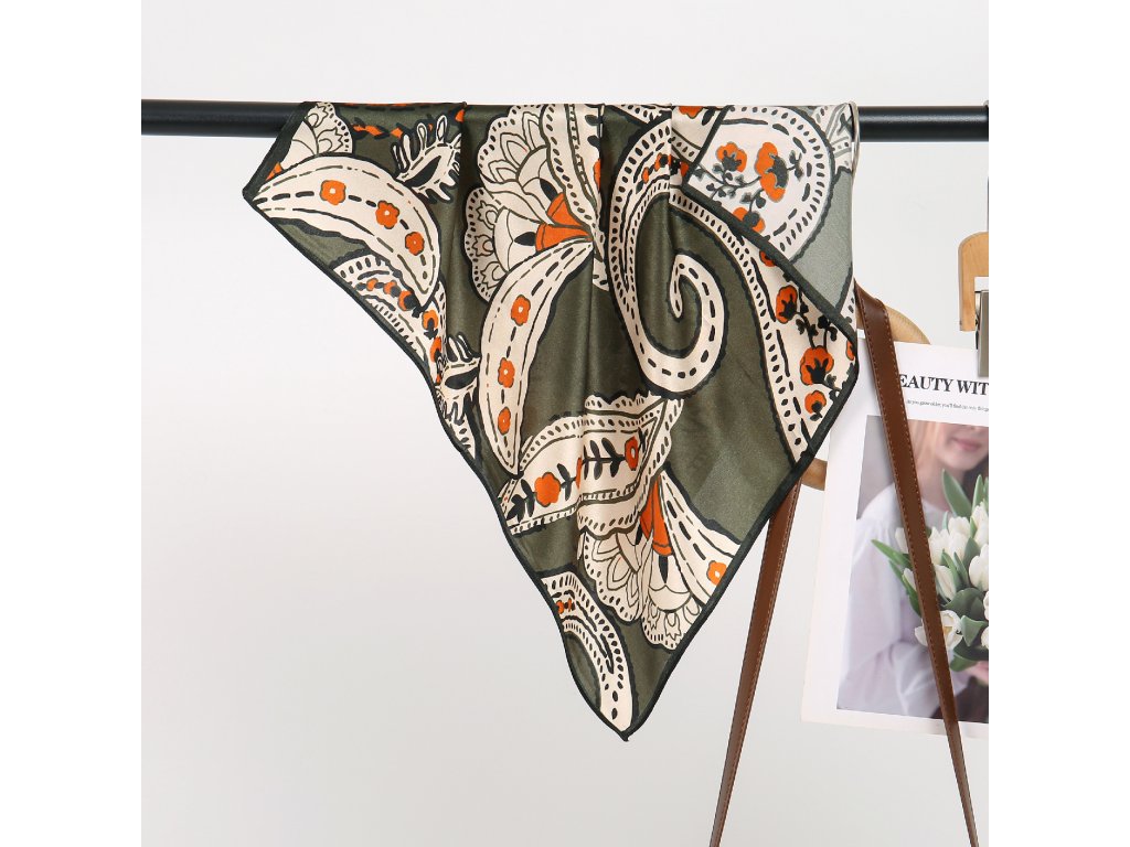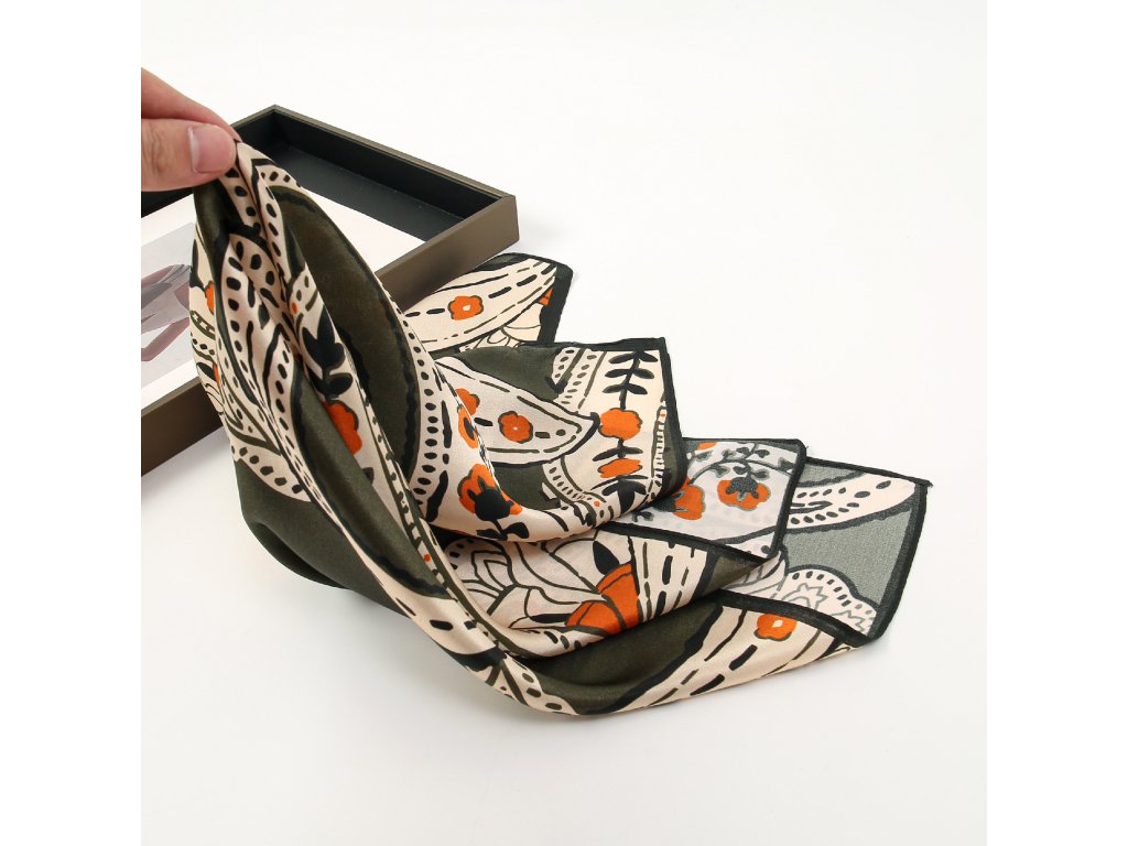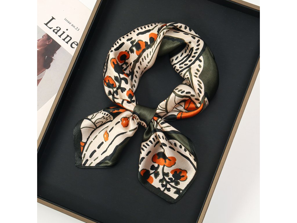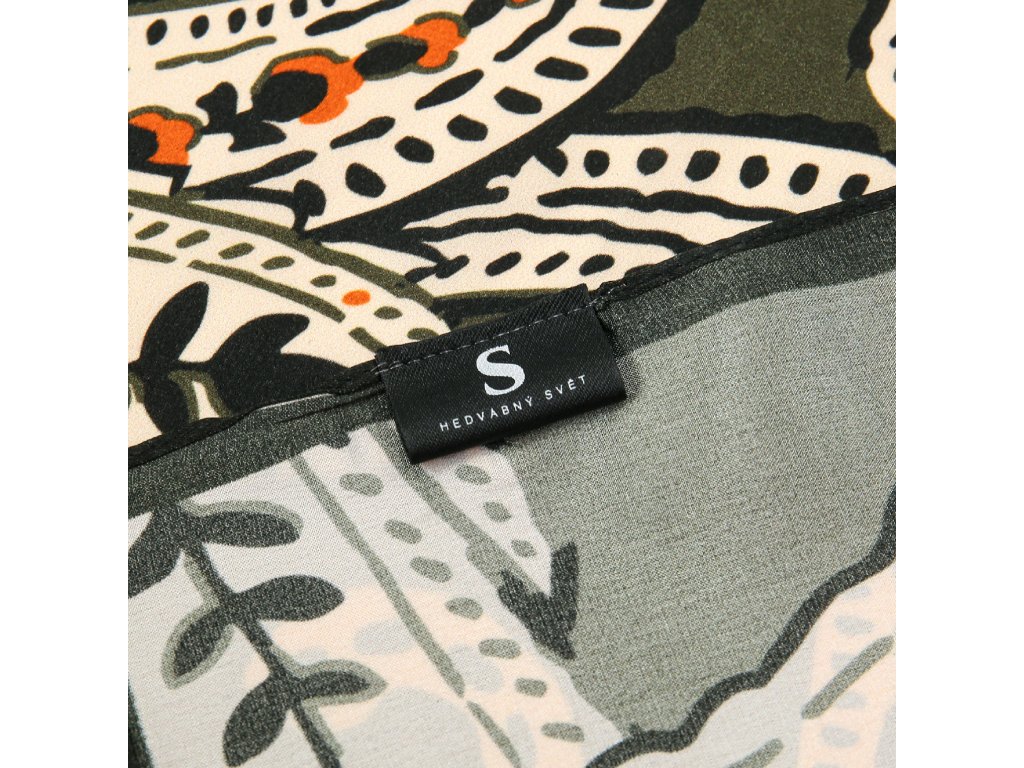 Hedvábný šátek zobrazuje etno vzor květů a lístků v odstínech barev tmavé khaki, bílé a oranžové oddělené černými linkami. Je vyroben z prémiového 100% morušového hedvábí o síle 12 vláken s jemně lemovaným okrajem. Šátek lze nosit na krku, na ruce, ve vlasech nebo jím ozdobit kabelku. Šátek je rovnou dárkově zabalen do hedvábného papíru a ozdobné kraftové krabičky se jmenovkou.