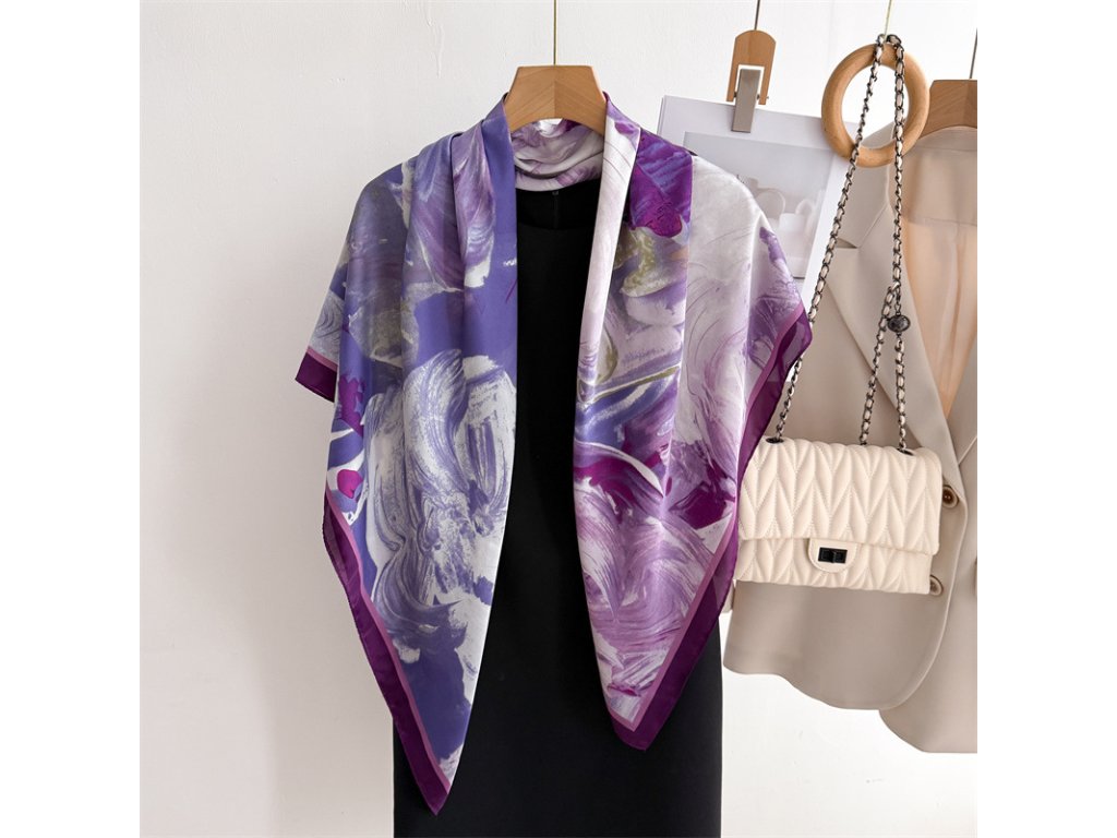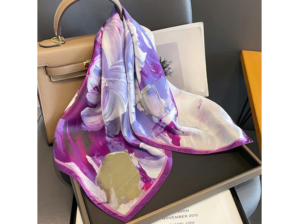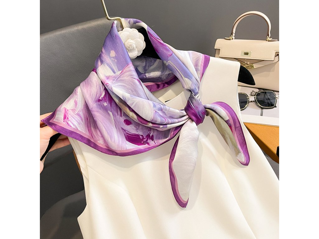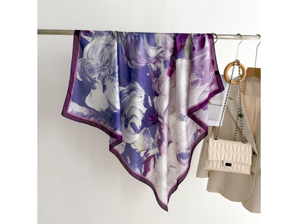 Elegantní šátek na kterém jsou spojeny bílé, fialové a tmavé odstíny. Tento šátek se skvěle může spojit s každodenním outfitem. Je vyroben z prémiového 100% morušového hedvábí o síle 12 vláken s jemně lemovaným okrajem v černé barvě. Šátek lze nosit na krku, na ruce, ve vlasech nebo jím ozdobit kabelku. Exkluzivní limitovaná edice, která je rovnou dárkově zabalena do hedvábného papíru a ozdobné kraftové krabičky se jmenovkou.