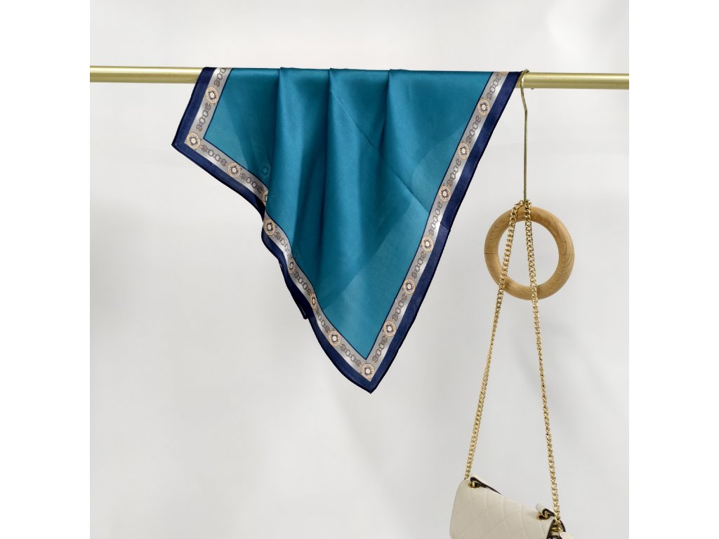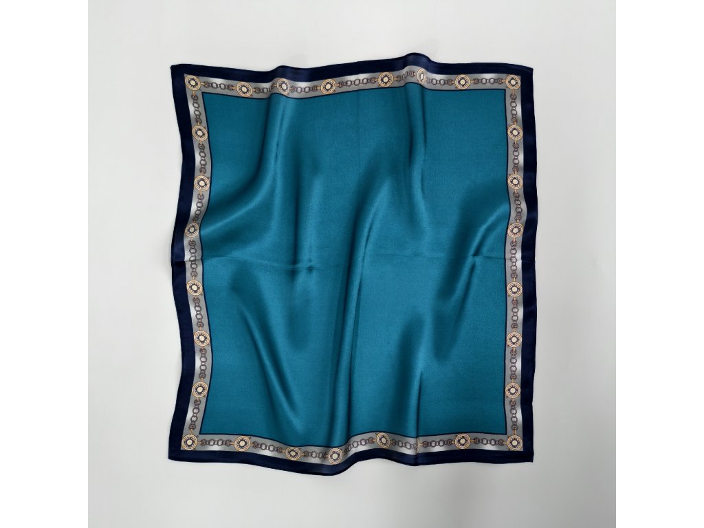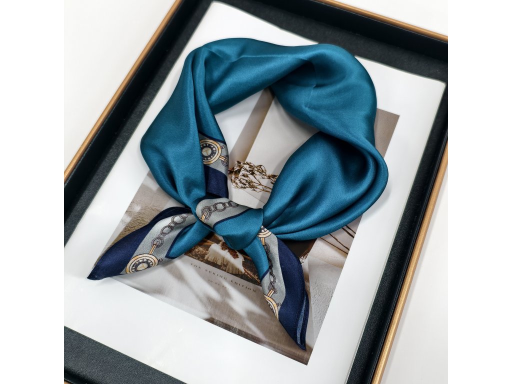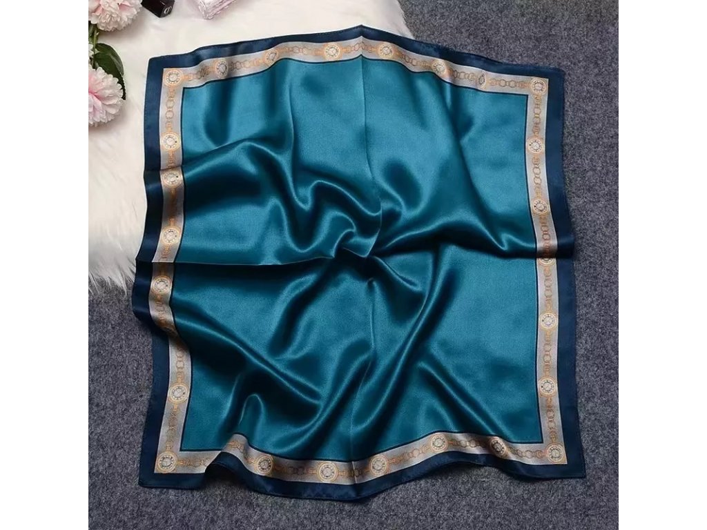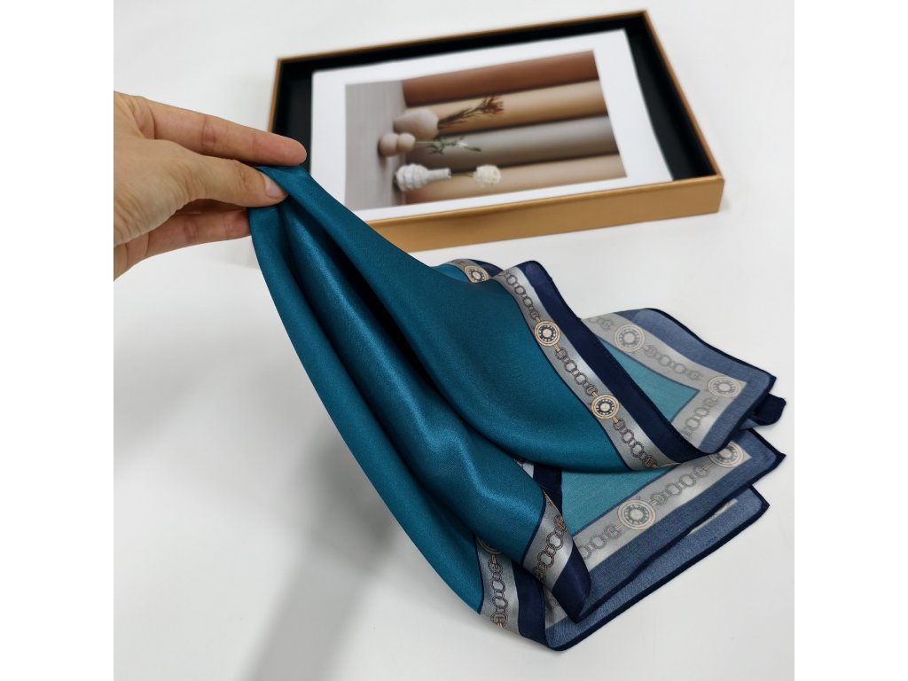 Velmi elegantní hedvábný šátek s krásnou petrolejovou barvou a ozdobným, jemně lemovaným okrajem. V nabídce je ještě ve stejném provedení, jen v oranžové barvě. Je vyroben z prémiového 100% morušového hedvábí o síle 12 vláken. Šátek lze nosit na krku, ke kabátu, košili či blůze, ve vlasech nebo jím ozdobit kabelku. Exkluzivní limitovaná edice, která je rovnou dárkově zabalena do hedvábného papíru a ozdobné kraftové krabičky se jmenovkou.