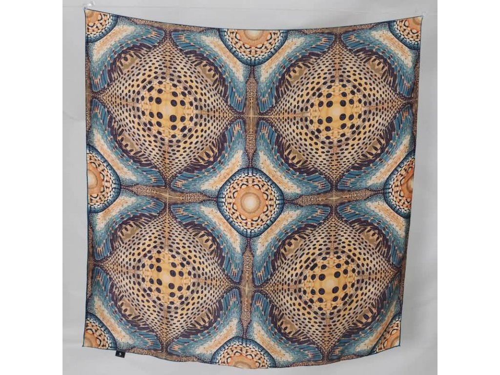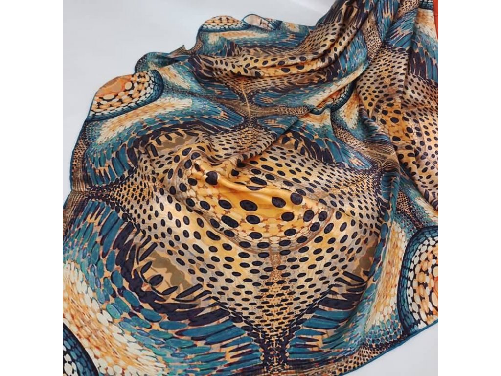 Velký hedvábný šátek ve výrazné kombinaci tyrkysové a měděné barvy se zajímavými obrazci. Je vyroben z prémiového 100% morušového hedvábí o síle 14 vláken s ručně rolovaným okrajem v tmavé tyrkysové barvě. Jeho velký rozměr 110x110 cm umožňuje mnoho kombinací nošení. Lze jej nosit např. jako top, pásek, sukni, pléd nebo jako moderní a účinná pokrývka hlavy. Exkluzivní limitovaná edice, která je rovnou dárkově zabalena do hedvábného papíru a ozdobné kraftové krabičky se jmenovkou na přední straně.