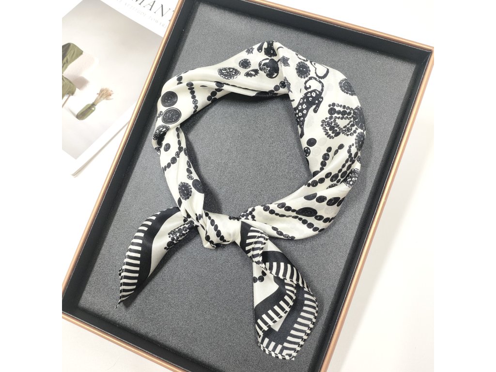 Elegantní šátek s netradičním černobílým vzorem zobrazujícím písmena, geometrické linie a symetrické vzory. Má jemně lemovaný okraj a je vyroben z prémiového 100% morušového hedvábí o síle 12 vláken. Šátek lze nosit na krku, ve vlasech, na ruce, jako ozdoba v pase nebo jím ozdobit kabelku. Exkluzivní limitovaná edice, která je rovnou dárkově zabalena do hedvábného papíru a ozdobné kraftové krabičky se jmenovkou.