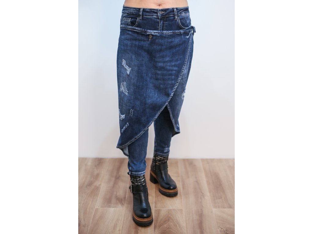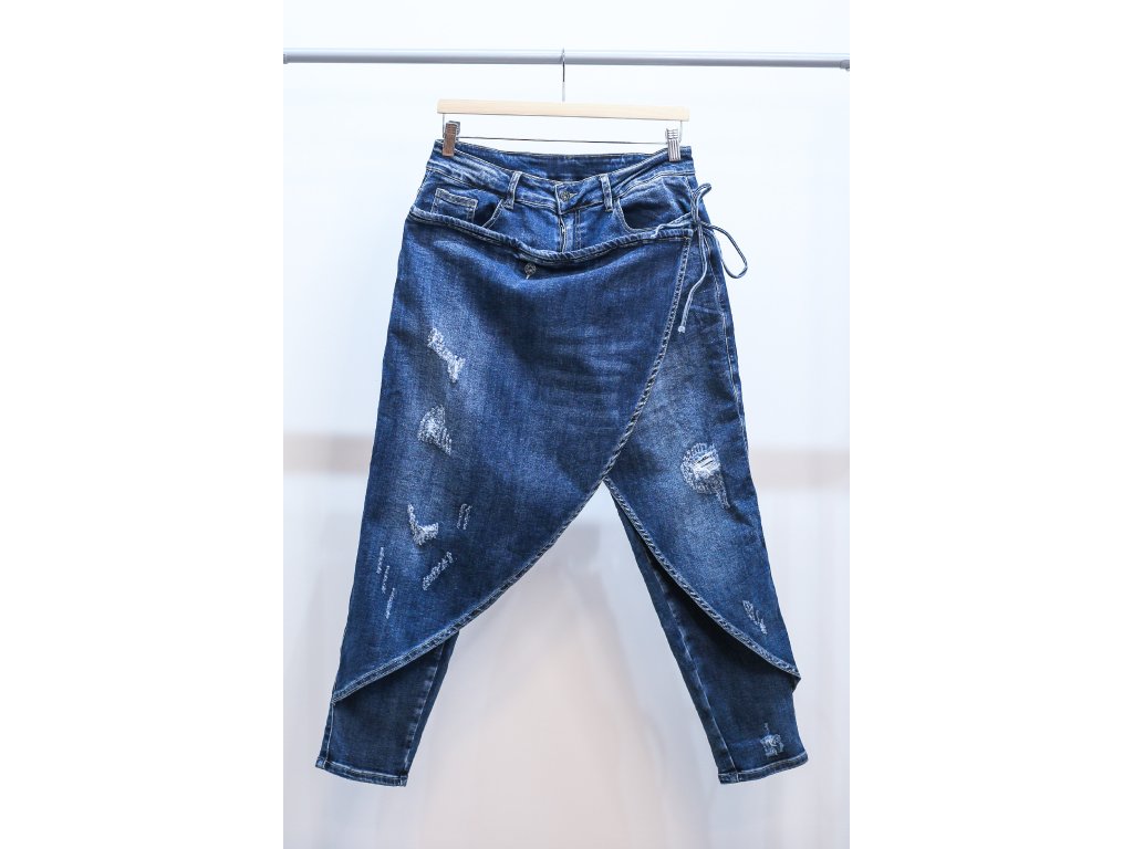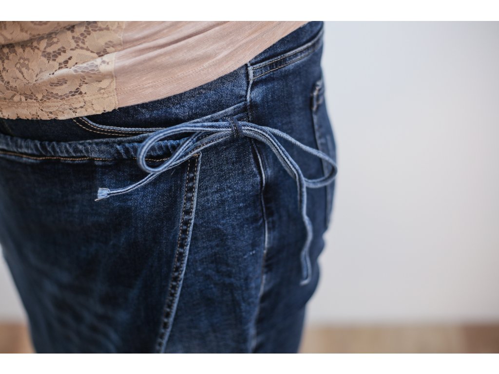 Džínové kalhoty s předním dílem s úvazem na boku jsou sofistikované, pohodlné a zároveň neotřelé. Díky určité elasticitě materiálu kalhot jsou flexibilní a pohodlné a dokonale podtrhnou váš městský styl. Mají normální pas a klasické zapínání na zip a knoflík. Svrchní zavinovací část je přišitá, upevněná na knoflík a zavazuje se na boku.