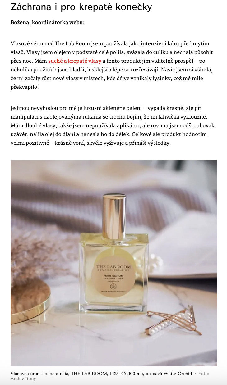 Jsme moc rádi, že vám můžeme naše přípravky přiblížit i skrz známé osobnosti, časopisy či internetové magazíny, protože ti již zkušenosti s našimi produkty mají a možná vám to pomůže i s výběrem. Na našich sociálních sítích @whiteorchidshopczsk na IG, FB najdete i další recenze od zákazníků či bloggerek.