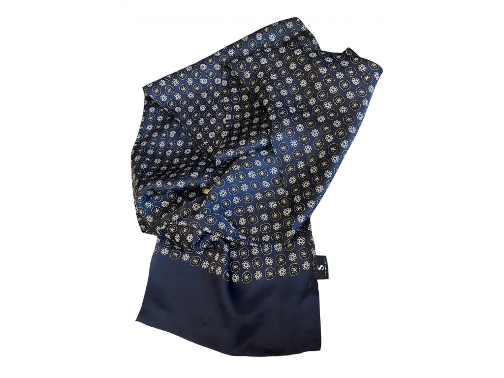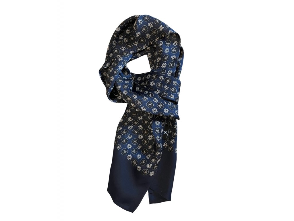 Elegantní dvouvrstvá hedvábná šála s tmavě modrým základem a jemným vzorem. Stylový doplněk k saku, kabátu či svetru se stejným designem z každé strany. Šálka je vyrobena z prémiového 100% morušového hedvábí o síle 12 vláken. Exkluzivní limitovaná edice, která je rovnou dárkově zabalena do hedvábného papíru a ozdobné kraftové krabičky se jmenovkou.