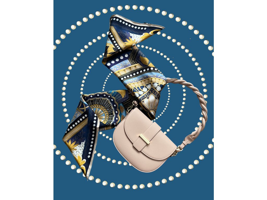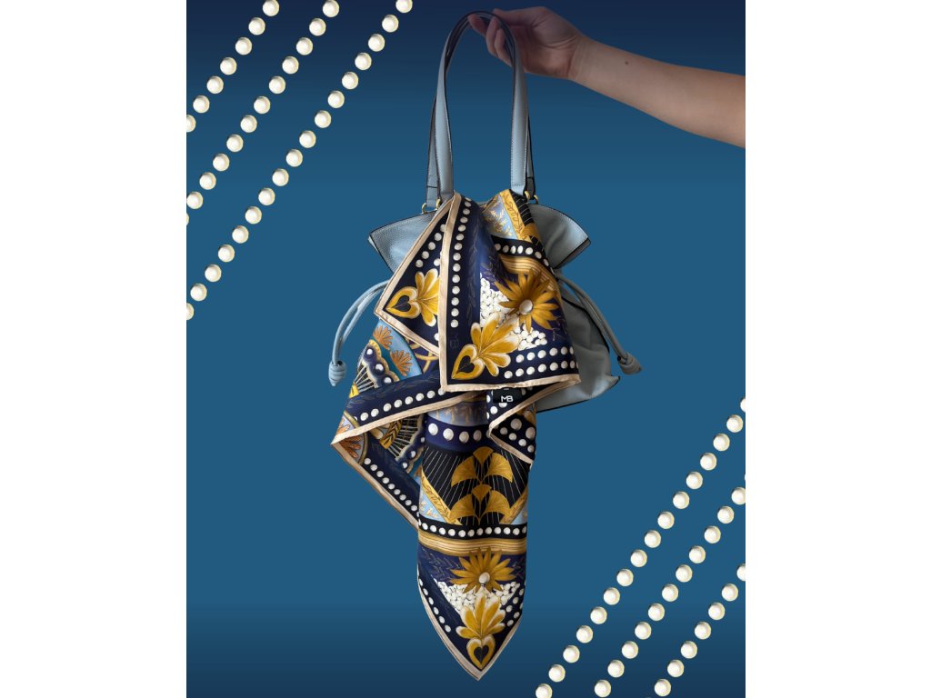 Náš autorský šátek zachycuje oslavu elegance a noblesy, která dodá nádech luxusu. Jeho výrazný geometrický vzor v tónech zlaté, safírově modré a hluboké černi připomíná zlatou éru 20. let minulého století. Je vyroben ze 100% morušového hedvábí v prémiové úpravě - 16 vláken, úprava twill, oboustranný tisk a ručně rolované okraje. Níže v detailu produktu naleznete slovo autora k námětu šátku.
