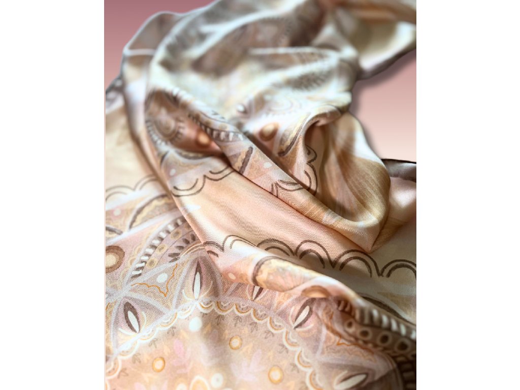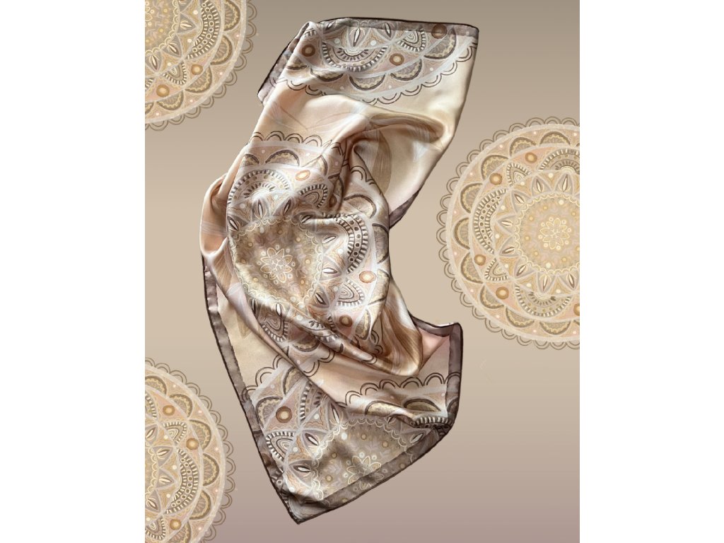 Náš autorský šátek zachycuje akvarelovou malbu mandal v jemných pískově-zlatavých tónech kombinových s odstíny hnědé. Nabízíme jej i v jiném barevném provedení. Detainí propracování malby z něho dělá malé umělecké dílo pro každý den. Je vyroben ze 100% morušového hedvábí v prémiové úpravě - 16 vláken, úprava twill, oboustranný tisk a ručně rolované okraje. Ve stejném designu nabízíme i kašmírovo-hedvábný pléd o velikosti 140x140 cm. Krásně se hodí ke kabelce Francesca - barva béžová. Níže v detailu produktu naleznete slovo autora k námětu šátku.