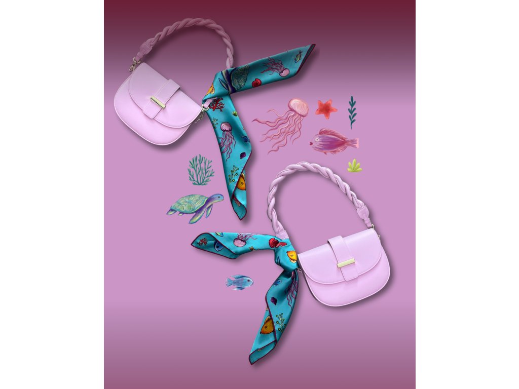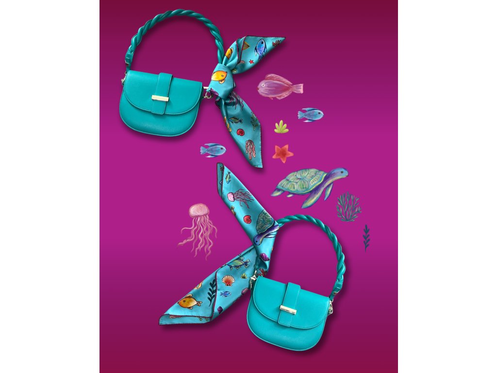 Náš autorský šátek zachycuje rozverné kresby mořské fauny v pestrobarevném provedení na tyrkysovém podkladu s ručně rolovaným fuchsiovým okrajem. Nakreslené želvy a rybky dovádějící mezi chaluhami vás nabijí svou energií a hravostí. Kromě klasického využití kolem krku se dá použít i jako ozdoba kabelky, ruky či na zakrytí vlasů jako ochrana před sluncem. Je vyroben ze 100% morušového hedvábí v prémiové úpravě - 16 vláken, úprava satin silk, oboustranný tisk a ručně rolované okraje. Je dárkově balený, takže stačí už jen předat.