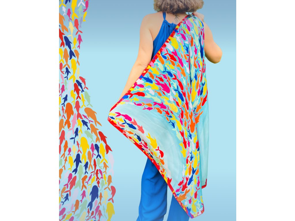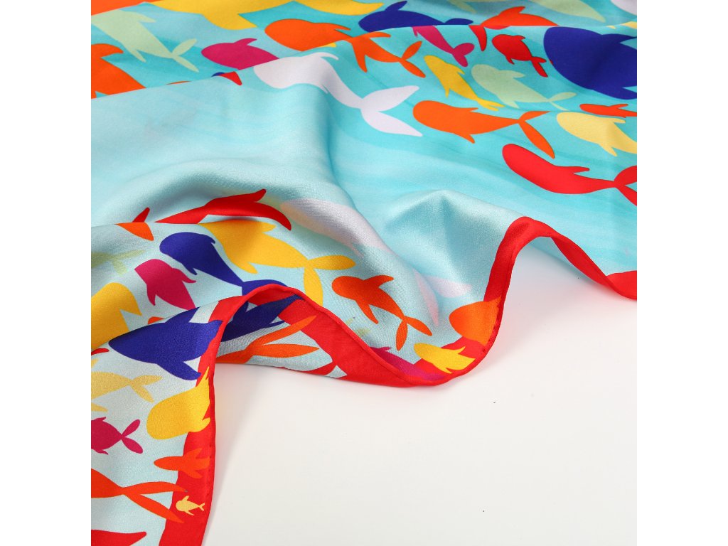 Veselý a hravý - takový je náš autorský šátek, který je spojen se sluncem, barvami a pohodou. Nádherné odstíny modrozeleného moře, v němž se prohání pestré rybky, skvěle doplní váš letní outfit. Toto je kousek, který rozhodně nesmí chybět na vaší výbavě na dovolenou. Kromě klasického využití se perfektně hodí i na zakrytí vlasů či do pasu. Je vyroben ze 100% morušového hedvábí v prémiové úpravě - 16 vláken, oboustranný tisk a ručně rolované okraje. Pro zdůraznění hebkosti a živosti motivu jsme vybrali vazbu saténové hedvábí, které je jemné a dá perfektně vyniknout všem barvám. Je dárkově balený, takže stačí už jen předat.