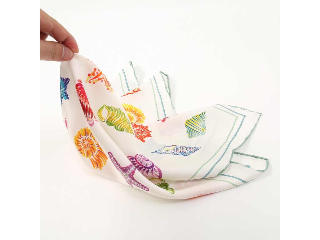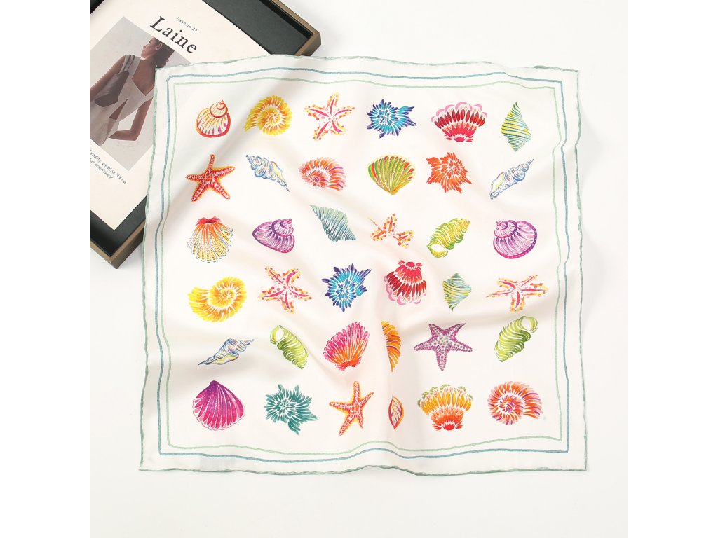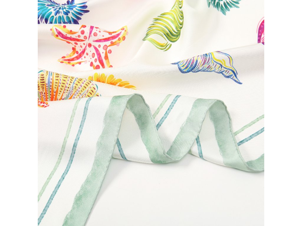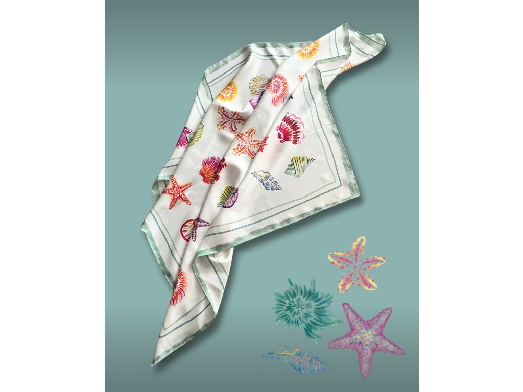 Tento autorský šátek zachycuje zářivou přehlídku exotických mušlí a mořských hvězdic. Pestré letní barvy lákají na výpravu za sluncem. Syté tóny žluté, oranžové, červené, modrozelené, růžovo-fialové a zelené září na krémovém podkladu doplněném o ručně rolované okraje ve světle zelené barvě. Šátek La Mušle je oslavou krás života. Je vyroben ze 100% morušového hedvábí v prémiové úpravě - 16 vláken, úprava twill, oboustranný tisk a ručně rolované okraje. Je dárkově balený, takže stačí už jen předat.