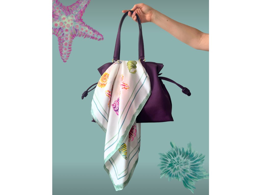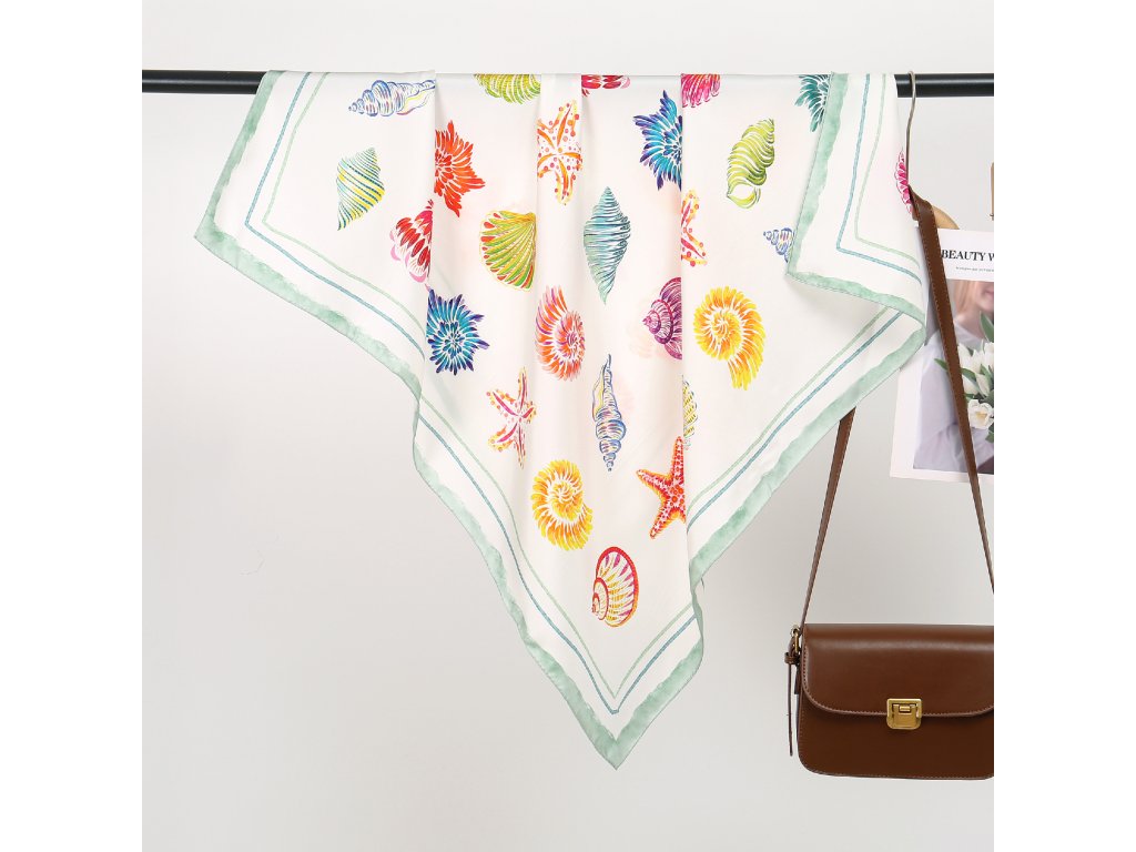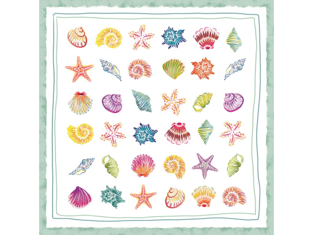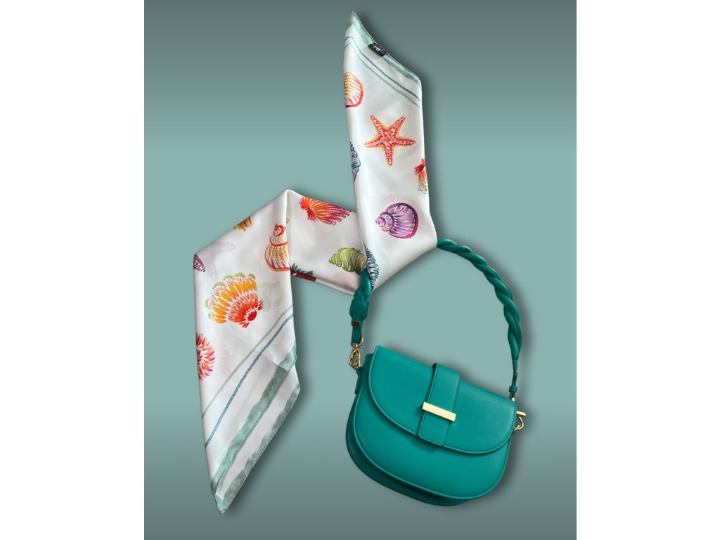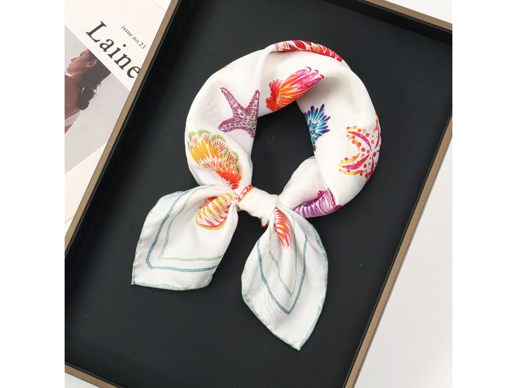 Tento autorský šátek zachycuje zářivou přehlídku exotických mušlí a mořských hvězdic. Pestré letní barvy lákají na výpravu za sluncem. Syté tóny žluté, oranžové, červené, modrozelené, růžovo-fialové a zelené září na krémovém podkladu doplněném o ručně rolované okraje ve světle zelené barvě. Šátek La Mušle je oslavou krás života. Je vyroben ze 100% morušového hedvábí v prémiové úpravě - 16 vláken, úprava twill, oboustranný tisk a ručně rolované okraje. Je dárkově balený, takže stačí už jen předat.