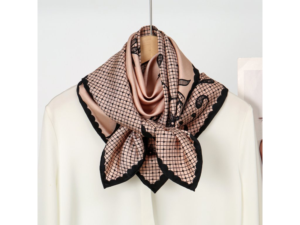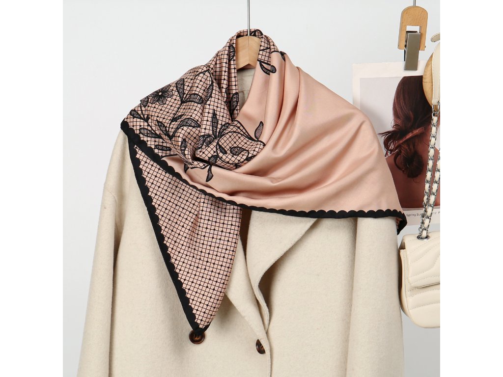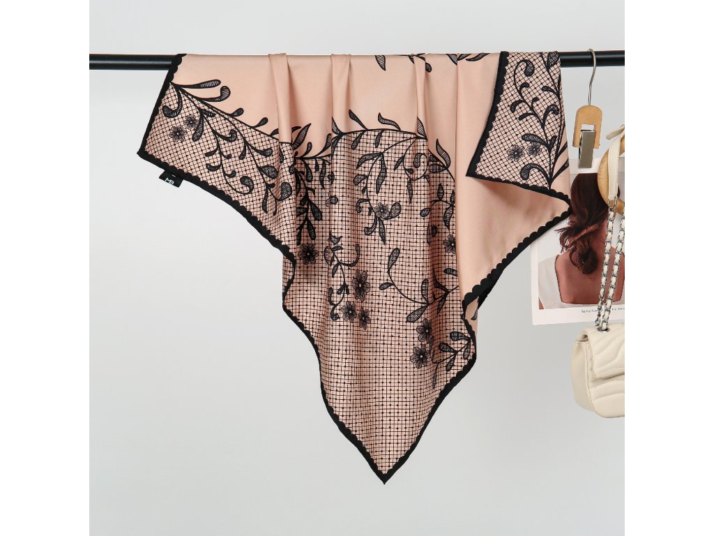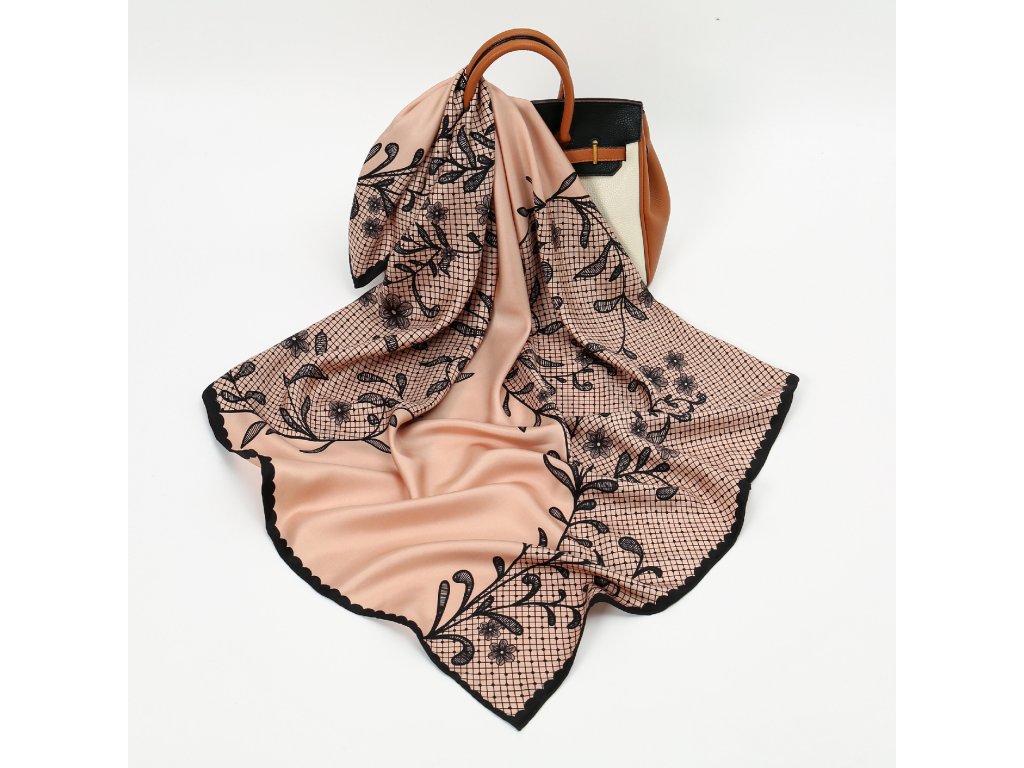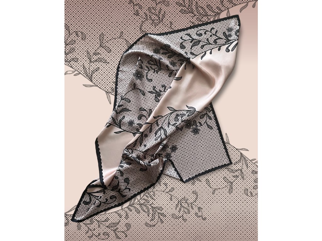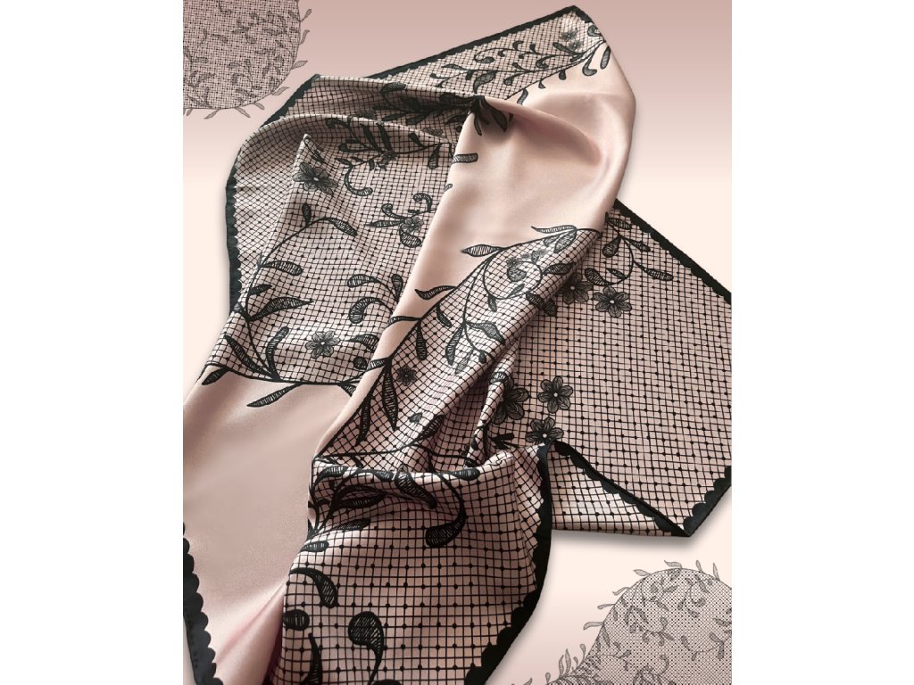 Náš autorský šátek evokuje pocit klidu a harmonie v každém detailu. Jemná pudrově růžová barva pozadí vytváří oblak něhy, na kterém rozkvétají černé květinové motivy krajky - lehké, vznosné a sofistikované. Dekorativní černý lem dodává designu hloubku a kontrastní eleganci. Je vyroben ze 100% morušového hedvábí v prémiové úpravě - 16 vláken, úprava twill silk, oboustranný tisk a ručně rolované okraje. Je dárkově balený, takže stačí už jen předat. Níže v detailu produktu naleznete slovo autora k námětu šátku.