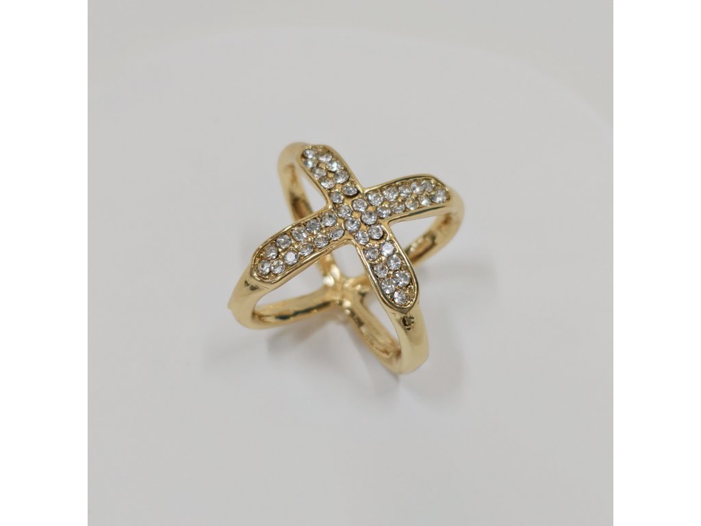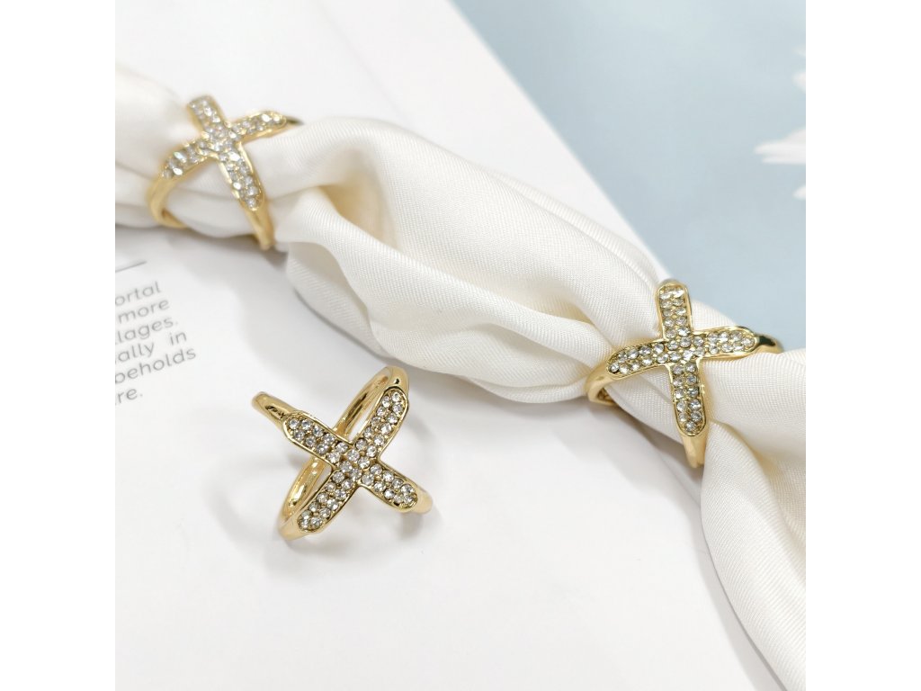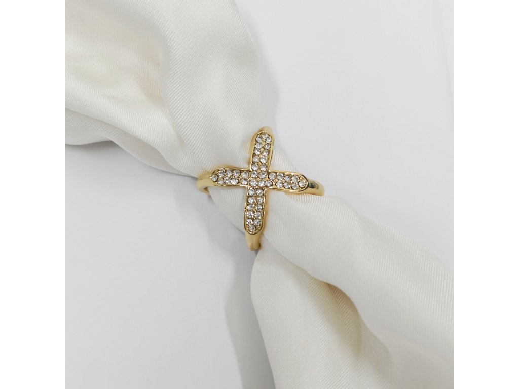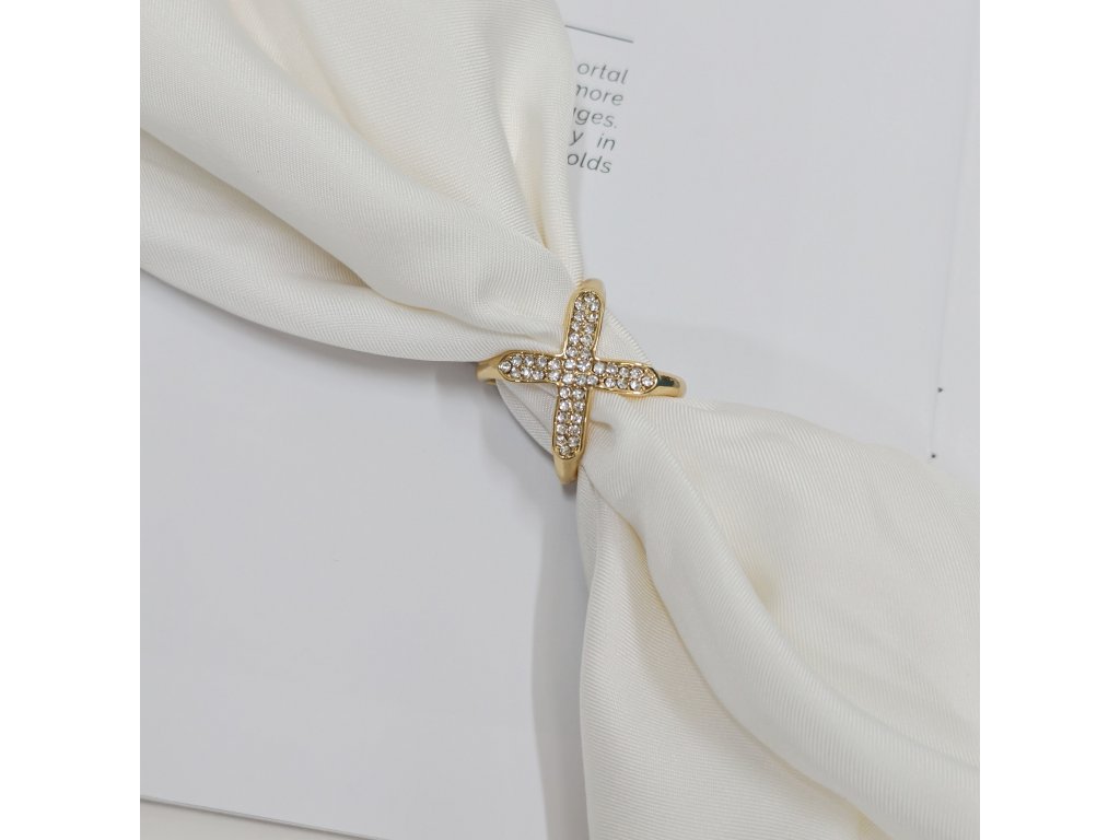 Elegantní třpytivá spona zlaté barvy pro snadné sepnutí šátku střední a větší velikosti má ve viditelné části tvar malého kříže vykládaného kamínky. Má 4 průvleky. Stylový doplněk, který umožní fixaci šátku a různé kreace. Spona je zabalena v dárkovém bavlněném pytlíčku se stuhou, který využijete i pro její uložení.